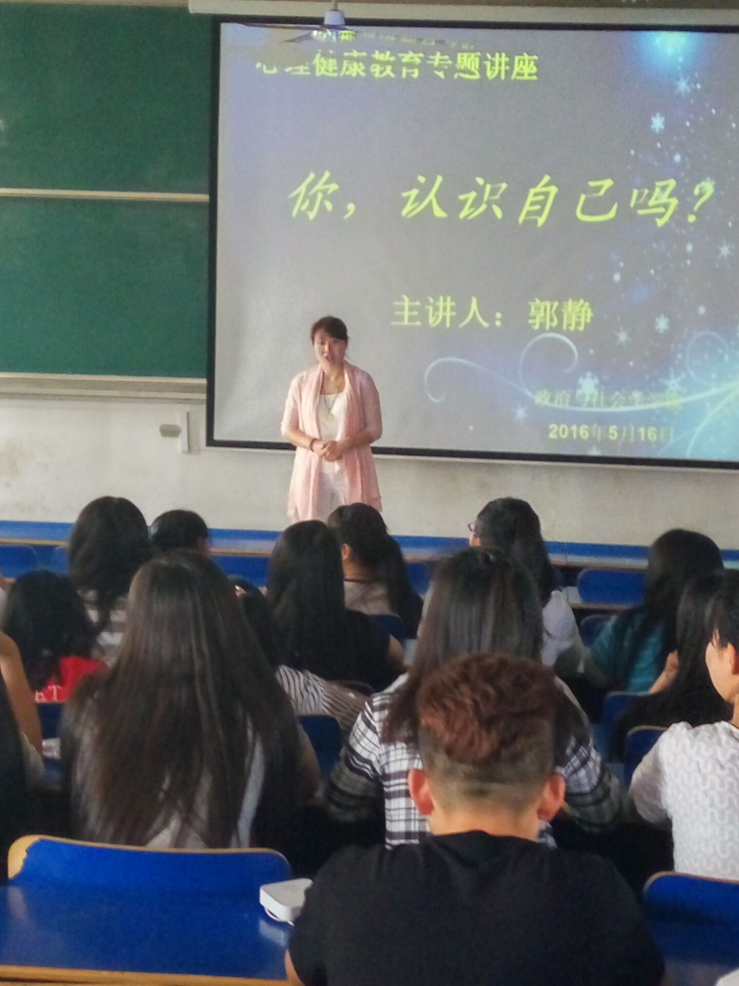 5月16日下午,政治与社会学学院在523教室举行以“你,认识自己吗”为主题的心理健康教育讲座。学院辅导员,14、15级全体同学参加了本次讲座。活动邀请国家二级心理咨询师、陕西省心理咨询师协会理事、青少年心理健康辅导中心副主任和陕西省家庭教育研究会理事—郭静老师做主讲。
